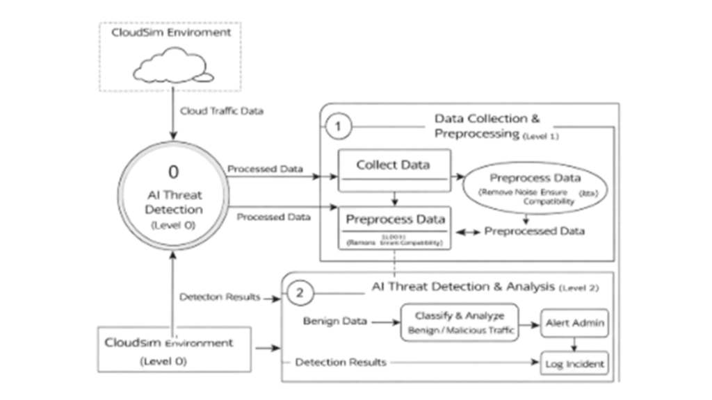 The Data Flow Diagram (DFD) depicts the movement of data within the proposed Ai based threat detection system, illustrating how input data is processed to generate actionable security outputs. It provides a clear view of interactions between cloud simulation, AI analysis, and reporting components.